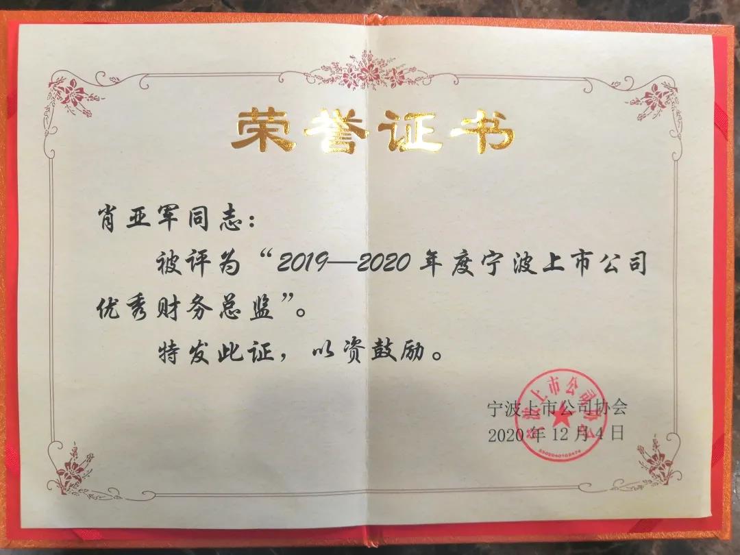 公司財務總監(jiān)肖亞軍被評為“寧波上市公司優(yōu)秀財務總監(jiān)”